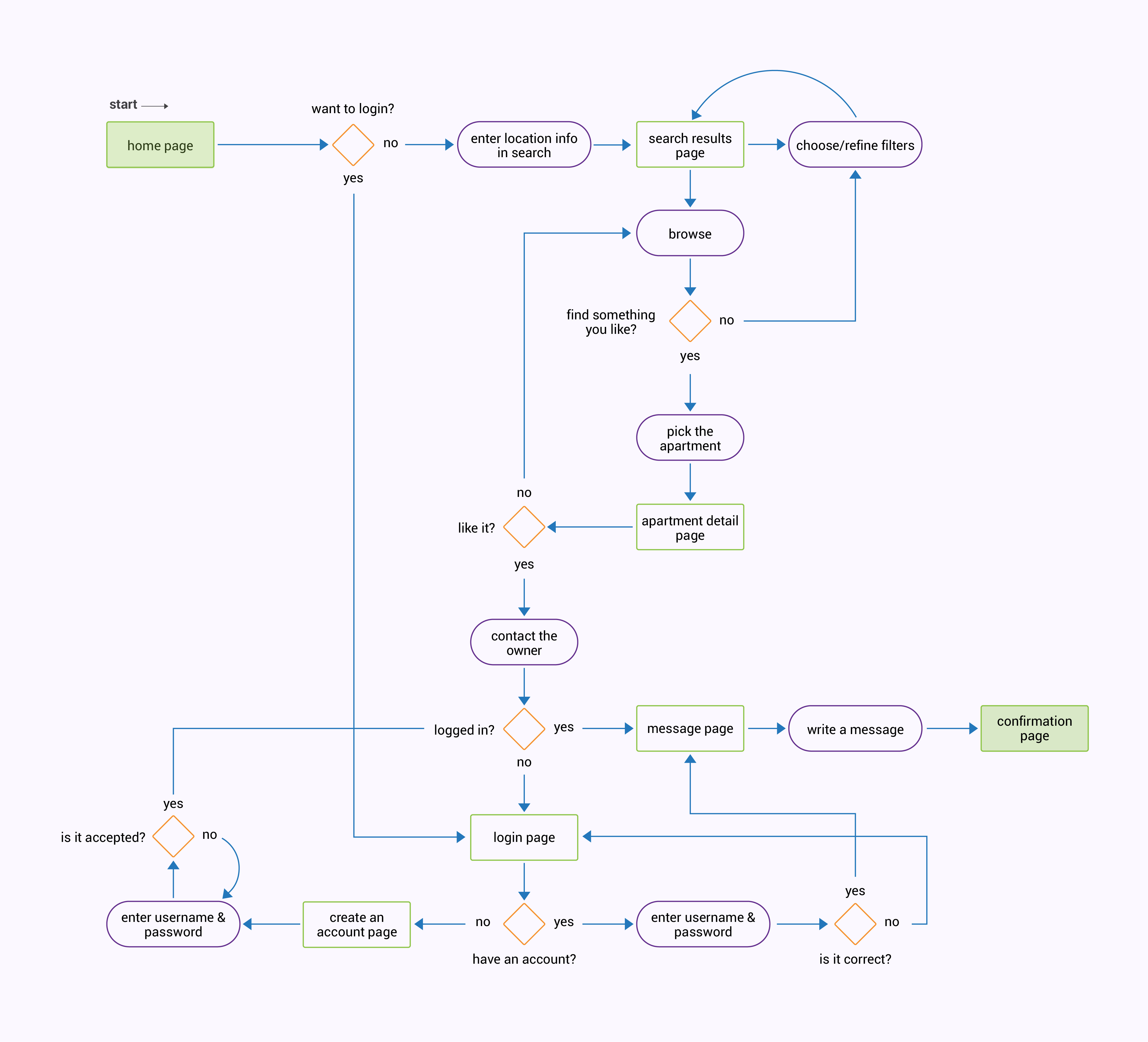 This task flow outlines how a user can search for an apartment in a specific area, refine results based on criteria, view details about an apartment, and contact the owner. The entire project was focused on streamlining this process and prioritizing user needs.
